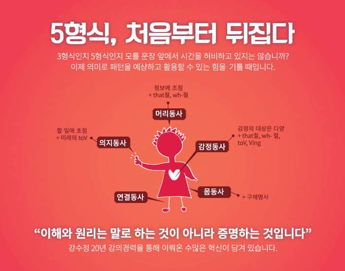 모호하고 그다지 유용하지도 않은 5형식은 버리자!동사의 의미를 통한 문법 구성의 원리를 배우면 문장의 구조가 더 쉽게 파악되고, 예측도 가능합니다.