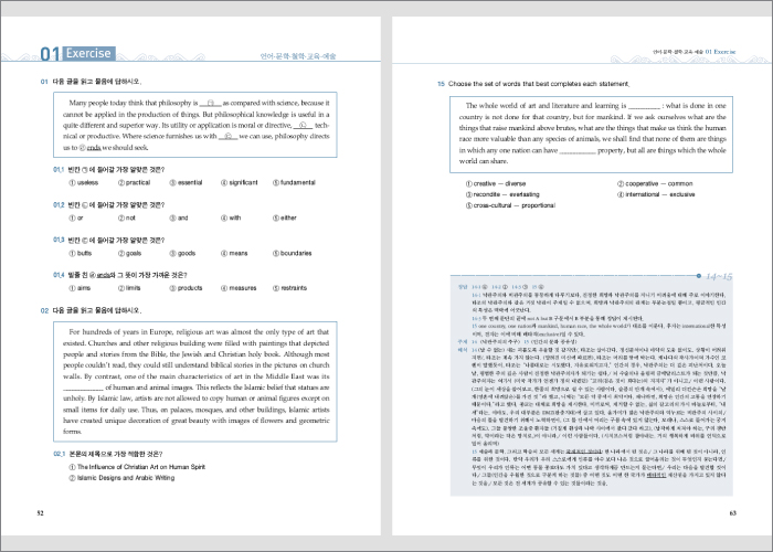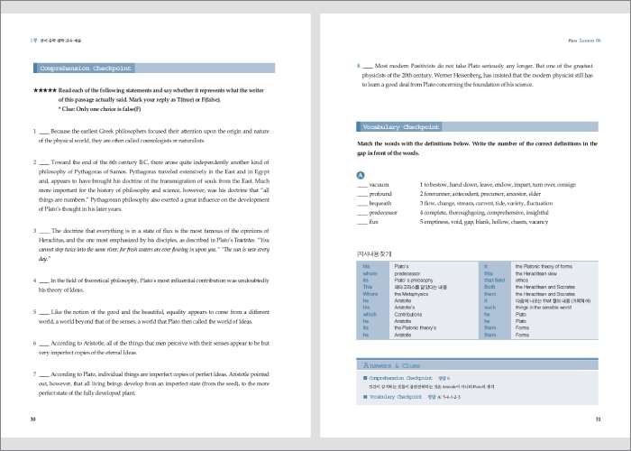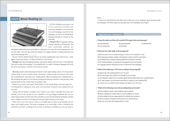 Comprehension 그리고 Vocabulary Checkpoint 문제들은 독해력의 핵심인 주제 파악력, 논리적 추론력 등을 키우고, 고급어휘를 체계적으로 정리해가며 익힐 수 있도록 한 것입니다. 또한, 장문(長文)을 통해 단련된 독해 실력을 총 8회 분량의 중단문 연습문제 풀이에도 응용 및 활용해 볼 수 있도록 구성하였습니다.